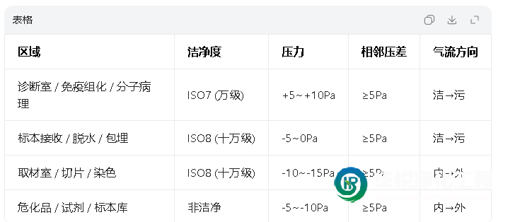 一、分區(qū)與壓力梯度(核心安全)病理科嚴(yán)格按清潔區(qū)→半污染區(qū)→污染區(qū)劃分,氣流必須從潔到污:清潔區(qū)(診斷室、免疫組化、分子病理、檔案室)微正壓:+5~+10Pa潔凈度:萬級(ISO 7) 或以上溫濕度:22±2℃、40%~60%RH換氣:6~10 次 /h半污染區(qū)(標(biāo)本接收、脫水、包埋)微負(fù)壓:-5~0Pa潔凈度:十萬級(ISO 8)換氣:10~12...