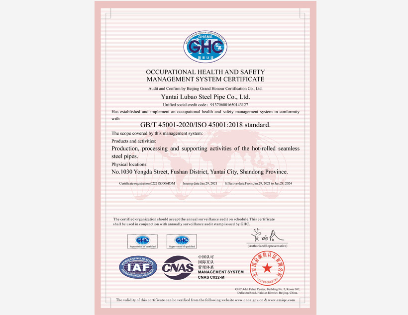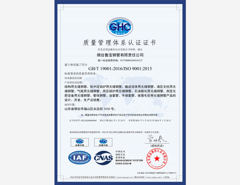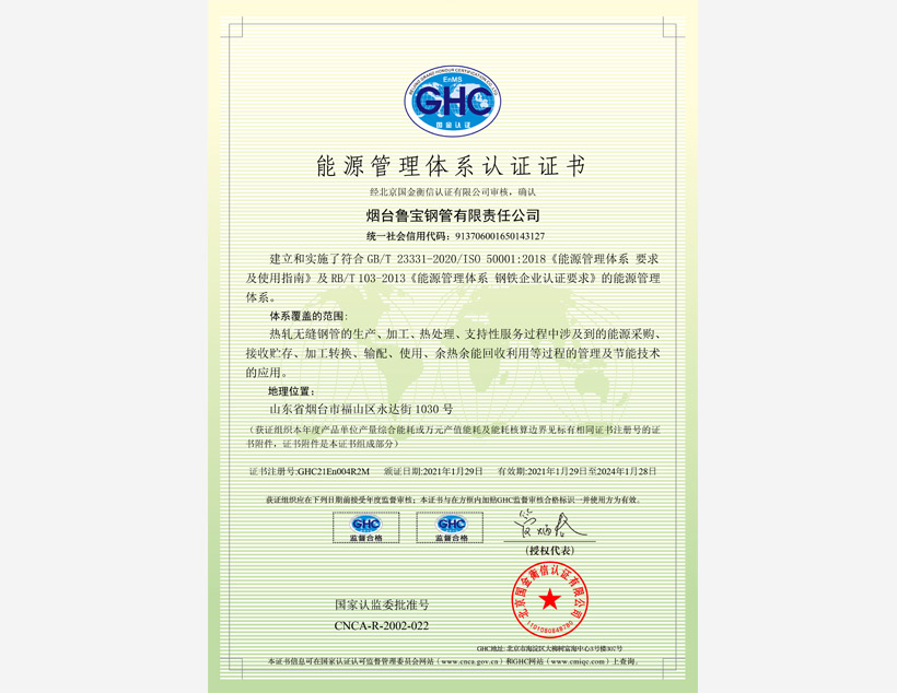 公司管理體系取得API Q1、ISO 9001、ISO 14001、ISO 45001和ISO 50001標準認證證書,實驗室取得ISO/IEC 17025認可證書。